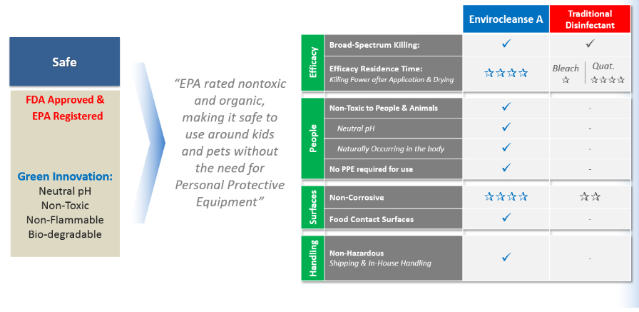 Replaces chlorine disinfectants and other oxidizing disinfectants. Our product is made up of naturally occurring substances. It is nontoxic (EPA rating of lowest possible toxicity equivalent of nontoxic). Also noncorrosive, nonflammable, sustainable and ready to use out of the bottle. Storage and spilling are not an issue since there are no harsh chemicals. No masks, gloves, or special equipment is required to use. Naturally breaks down into a saltwater solution after degrading which is harmless to the environment, humans and other warm-blooded animals.